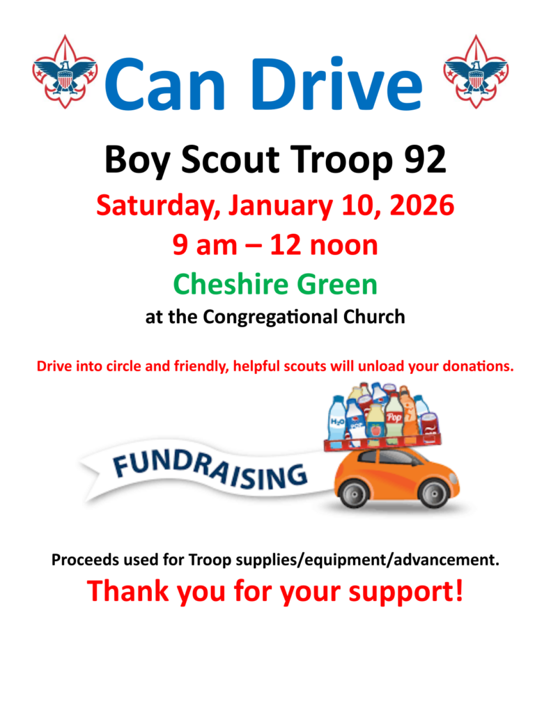 Support Troop 92 while recycling your cans and bottles! The latest iteration of the Troop’s Can Drive is this Saturday, January 10, 2026 from 9 AM to 12 noon at the Cheshire Town Green. Drive into the circle and friendly, helpful Scouts will unload your donations.